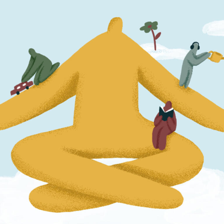 Virtual care package created by On Being that consists of podcasts, poetry, meditations and reflections. It can help us get through exhaustion and stress. Illustration created by Andrea Ucini
